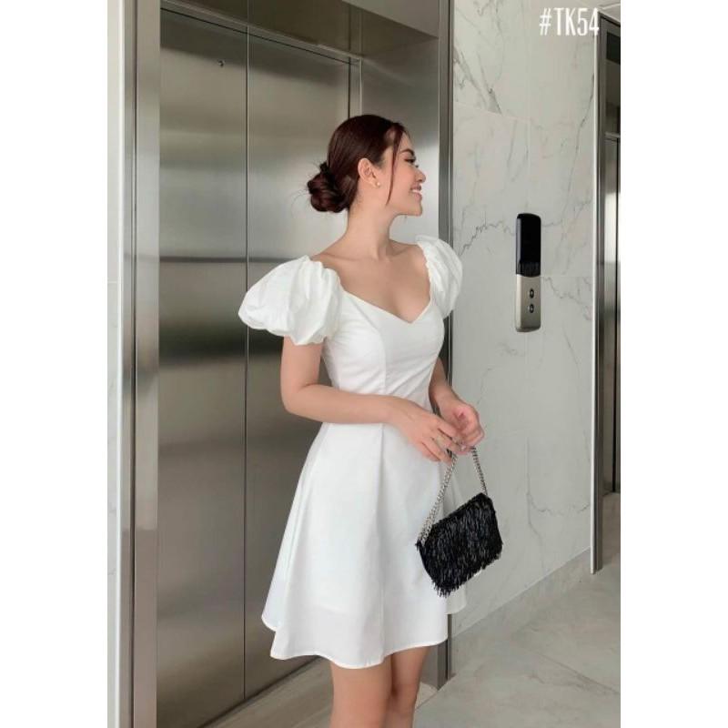 Đầm váy nữ trắng xòe tay bồng cổ V TKN
