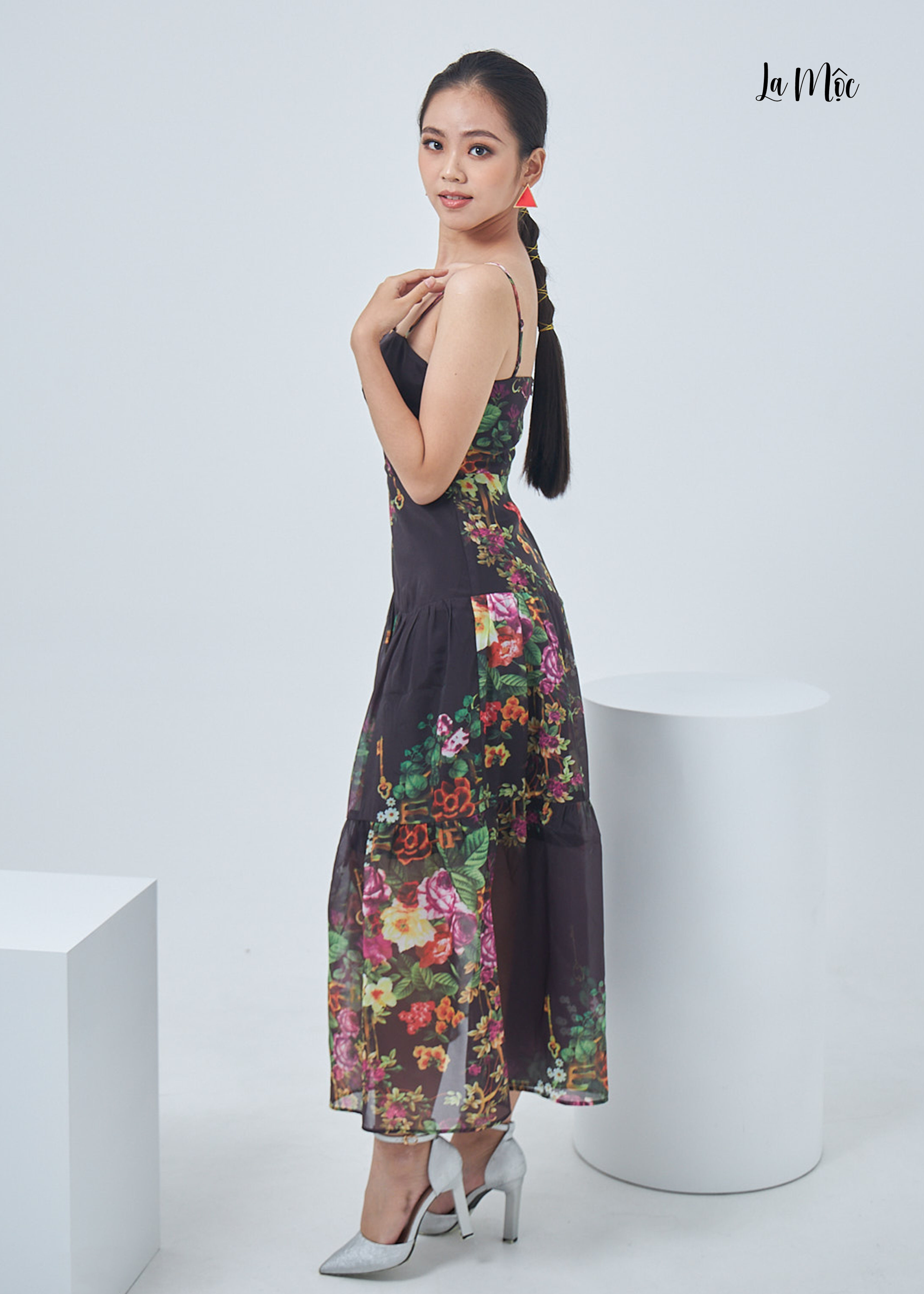Đầm voan La Mộc 2 dây cúp ngực, chất liệu Chiffon Korea họa tiết hoa, chân váy xòe, ôm eo.