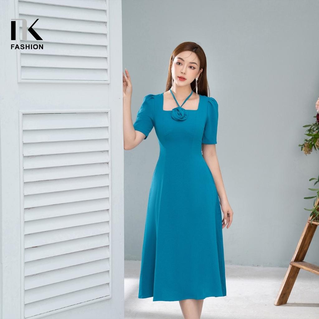 + Đầm nữ thiết kế dáng xòe nhẹ nhàng che khuyết điểm, thiết kế cổ vuông đính hoa nữ tính thanh lịch