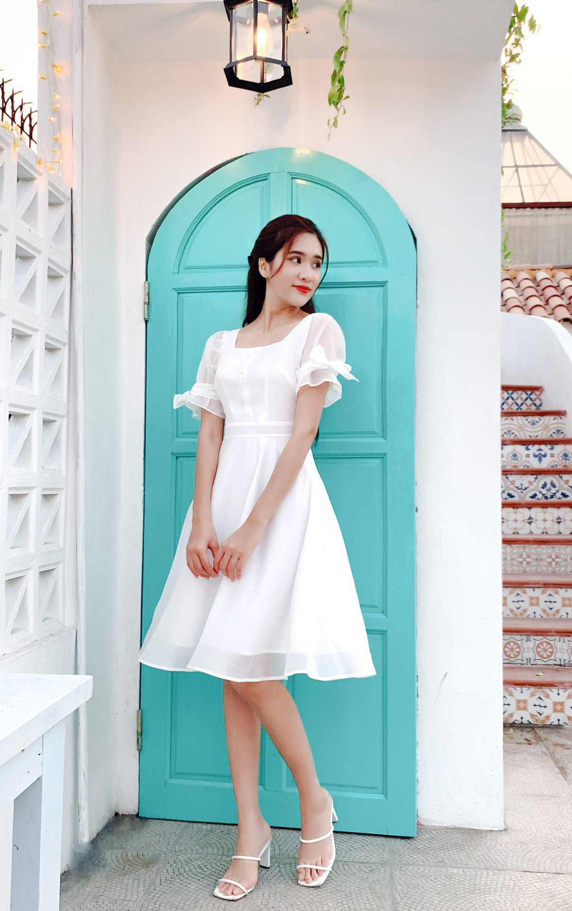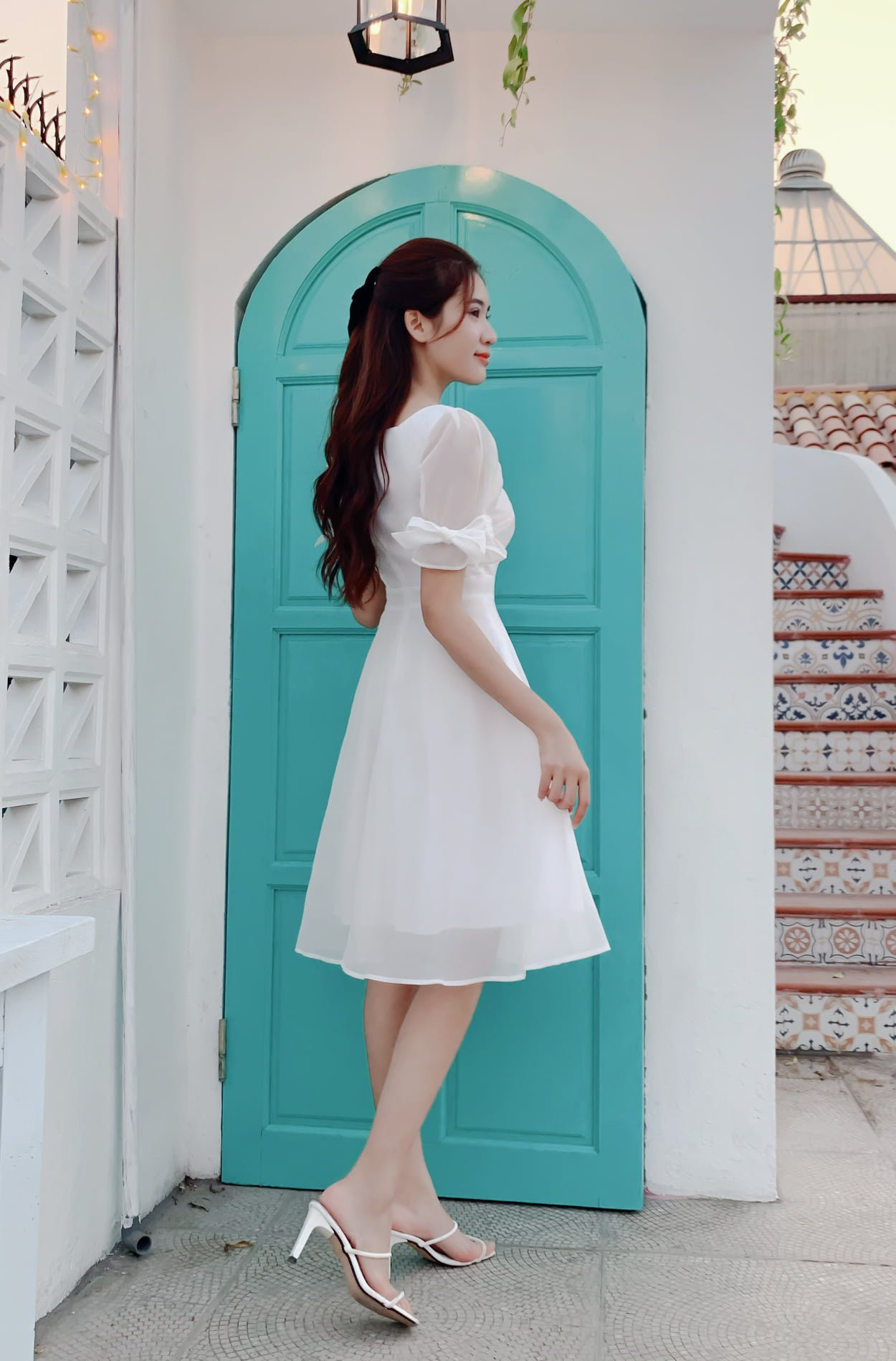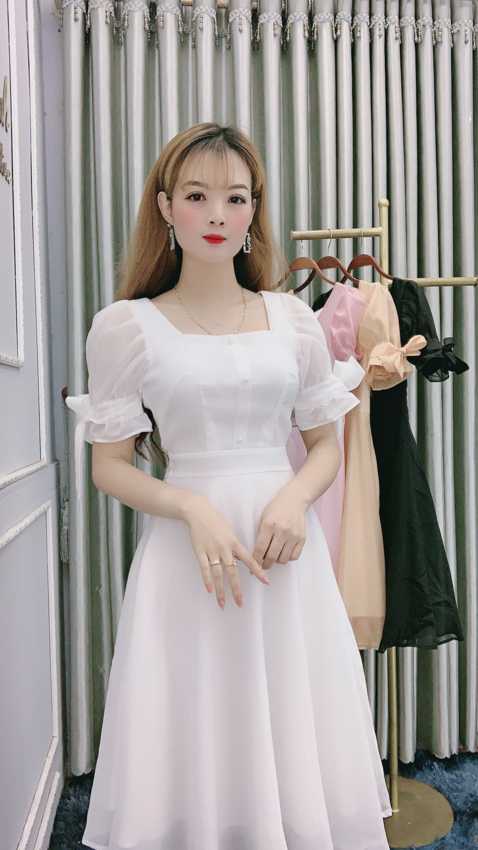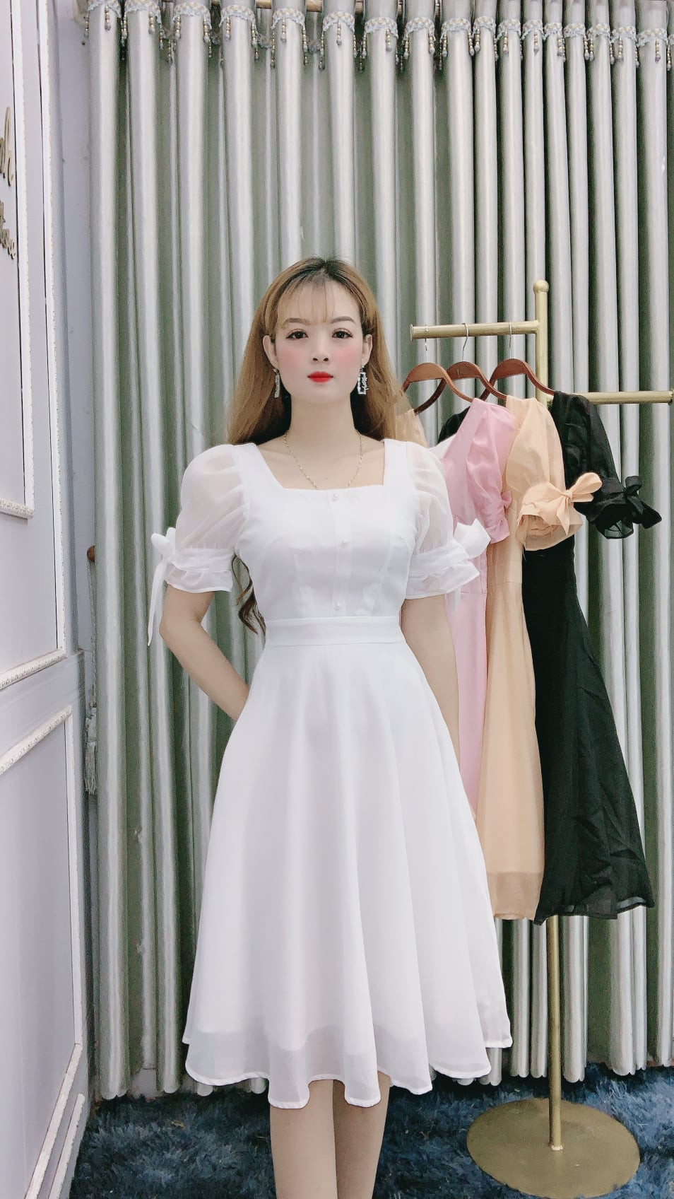 Kiểu dáng : đầm xòe, cổ vuông, tay phồng thắt nơ, đính nút hạt trai, dây kéo sau lưng