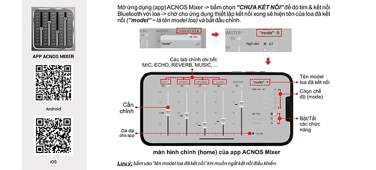 Sử dụng ứng dụng (app) ACNOS Mixer kết nối Bluetooth với loa CS366PLUS để điều khiển, tinh chỉnh chi tiết thêm cho bộ xử lý tín hiệu nhạc, micro, vang,... của loa, cho phù hợp với không gian và sở thích nghe nhạc, hát karaoke của bạn. Quét mã QR ở trên hoặc vào CH Play (Play Store) trên Android hoặc App Store trên iOS, để cài đặt và sử dụng ứng dụng.