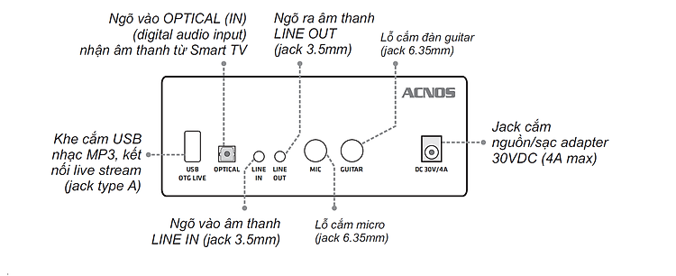 Loa karaoke xách tay ACNOS CS366PLUS là một thiết bị âm thanh có các cổng kết nối sau: