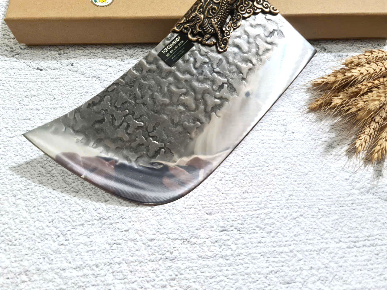 Chất liệu tay cầm: gỗ CẨM LAI, khâu và chuôi cuối dao bằng đồng thau