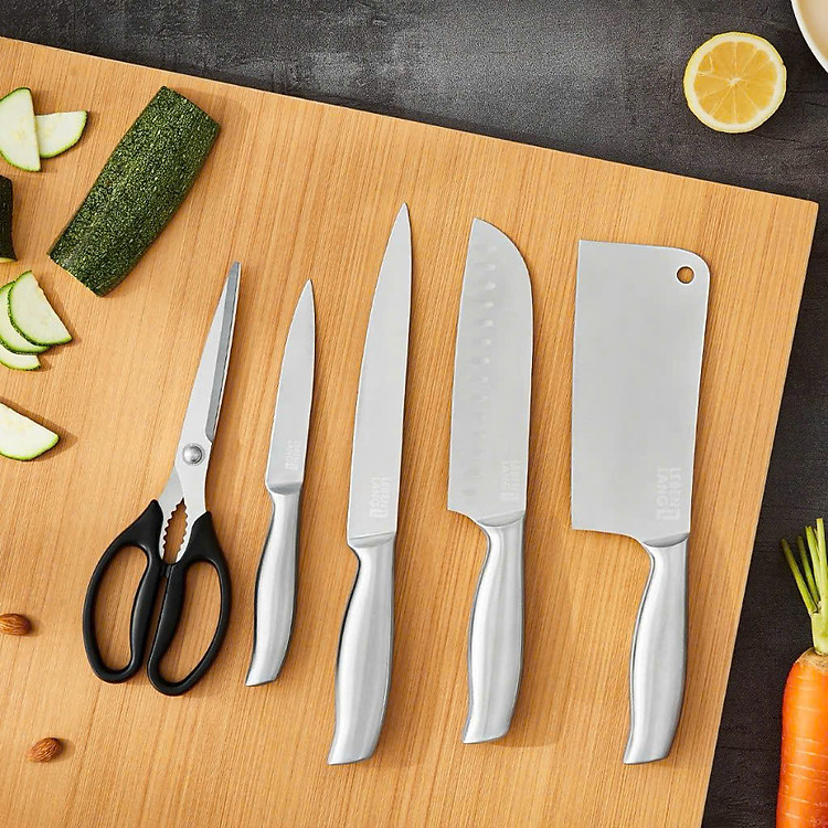 - Sở hữu 4 loại dao đa dạng và một chiếc kéo sắc bén, bộ sản phẩm này trở thành người bạn đồng hành đáng tin cậy trên mọi bếp lửa. Với lưỡi dao sắc bén và chất liệu thép không gỉ cao cấp, bạn có thể dễ dàng thực hiện mọi công việc nấu nướng một cách nhanh chóng và hiệu quả.