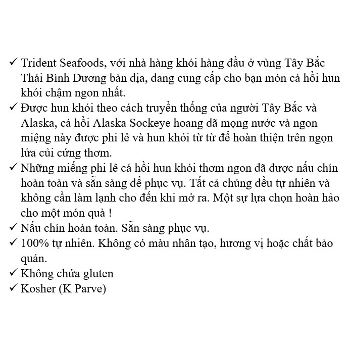 Giới thiệu [DATE 10/2027] Cá hồi xông khói ĐÓNG HỘP Trident Seafoods Wild Alaska Smoked Sockeye Salmon 454G