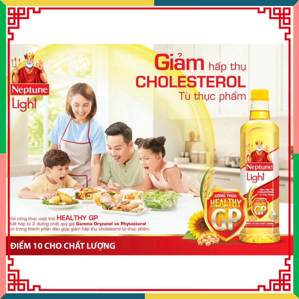 "Thể tích: 1L 'Dầu ăn thượng hạng Neptune Light không chứa cholesterol, đặc biệt với công thức Healthy GP giúp cơ thể giảm hấp thụ cholesterol từ thực phẩm. Neptune Light - Giảm hấp thụ cholesterol từ thực phẩm '- Giảm hấp thụ cholesterol từ thực phẩm: Không những không chứa cholesterol, dầu ăn thượng hạng Neptune Light còn giúp cơ thể giảm hấp thụ cholesterol từ thực phẩm nhờ vào công thức vượt trội Healthy GP - đây là sự kết hợp tuyệt vời giữa 2 dưỡng chất Gamma-Oryzanol và Phytosterol có trong thành phần dầu. - Thành phẩm hoàn toàn chất lượng và mang lại đầy đủ dưỡng chất tốt cho sức khỏe Neptune Light được sản xuất từ những thành phần dầu tự nhiên cao cấp: Dầu gạo lứt: Được trích ly từ lớp vỏ cám của hạt gạo lứt, giàu dưỡng chất quý giá Gamma-Oryzanol. Dầu đậu nành: Chiết xuất từ những hạt đậu nành được chọn lọc kỹ lưỡng, chứa hàm lượng cao các dưỡng chất Omega 3, 6, 9 & Phytosterol. Dầu hướng dương: Từ các cánh đồng nguyên liệu cao cấp, dồi dào Vitamin E tự nhiên. Sản xuất tại: Việt Nam Hạn sử dụng: 2 năm từ ngày sản xuất ***Bảo quản Để nơi khô ráo & thoáng mát, tránh ánh sáng trực tiếp.
