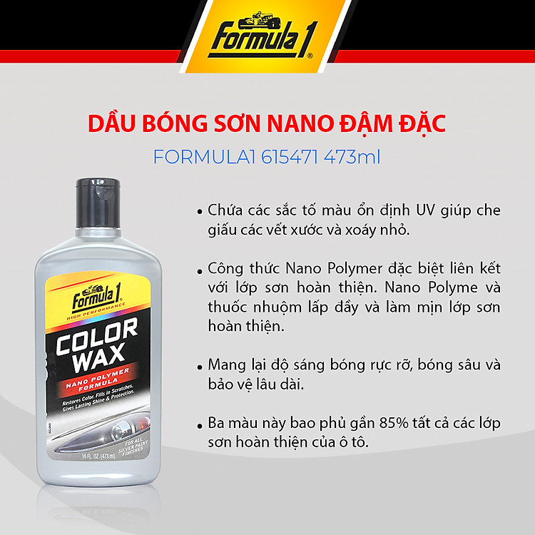Dầu bóng sơn nano đậm đặc cho xe màu bạc FORMULA 1 615471 473ml với sắc tố ổn định tia UV và công thức Nano Polymer giúp lấp đầy và làm mịn lớp sơn, mang lại vẻ sáng mịn cho xe.