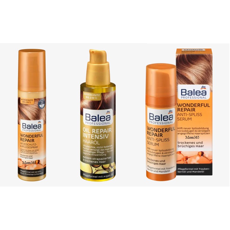 ☘️☘️☘️Dầu dưỡng: 100ML ✅ Công thức siêu nhẹ, không nhờn ✅ Cung cấp cho tóc sự chăm sóc phong phú - để sử dụng hàng ngày ✅ Dành cho tóc khô và hư tổn nặng ✅ Công thức chăm sóc với dầu argan ✅ Bảo vệ nhiệt lên đến 230 ° C Dầu dưỡng tóc chuyên sâu Balea có công thức mạnh mẽ cho kết quả rõ rệt và có thể nhìn thấy được, đồng thời là giải pháp hỗ trợ ngay lập tức để thuần hóa tóc hư tổn nặng. Dầu dưỡng tóc đảm bảo cho tóc khỏe, chắc và bóng mượt cho đến tận ngọn. Nó cũng làm cho tóc của bạn mềm mại và dẻo dai mà không làm nặng tóc 👉👉👉Có thể được sử dụng để chăm sóc trước khi gội đầu hoặc trên tóc đã được làm khô bằng khăn. Nó mang lại cho mái tóc khô một độ bóng khỏe và mềm mượt. ❌❌❌Tỷ lệ dầu tự nhiên cao có thể dẫn đến sự sai lệch màu sắc hoặc vón cục của sản phẩm. Điều này không ảnh hưởng đến chất lượng. Vui lòng bảo vệ khỏi ánh nắng trực tiếp. ☘️☘️☘️Serum chống chẻ ngọn 30ML ✅Giúp ngăn ngừa chẻ ngọn mới & hàn gắn các ngọn tóc hư tổn ✅Dành cho tóc khô và dễ gãy ✅Công thức chăm sóc với hạt nho và dầu hạnh nhân Serum chống chẻ ngọn của Balea Professional là sản phẩm lý tưởng cho tóc khô và dễ gãy. Nó lấp đầy các điểm yếu xốp và làm mượt cấu trúc tóc một cách rõ ràng và đáng kể. Đồng thời, tóc gãy rụng giảm đáng kể và nếu sử dụng thường xuyên, các ngọn tóc cũng được bảo vệ khỏi những phần tóc chẻ ngọn mới. Vì vậy, huyết thanh với một công thức mạnh mẽ và là một sản phẩm chăm sóc nuôi dưỡng hiệu quả sâu cho mái tóc hư tổn của bạn. 👉👉👉Mát xa một vài giọt vào đuôi tóc và những vùng tóc bị căng. Có thể sử dụng trên tóc khô hoặc tóc ẩm ☘️☘️☘️Xịt dưỡng nhiệt 150ML ✅Bảo vệ nhiệt lên đến 230 ° C ✅Bảo vệ tóc khỏi tác động của nhiệt, nuôi dưỡng sâu và giảm gãy rụng tóc ✅Dành cho tóc khô và dễ gãy Xịt bảo vệ và chăm sóc nhiệt từ Balea đảm bảo mái tóc bóng mượt, mềm mượt tự nhiên ngay cả sau khi sử dụng các dụng cụ nhiệt. Và nhờ tác dụng chống chẻ ngọn, các ngọn tóc sẽ được bảo vệ khỏi những phần tóc chẻ ngọn mới khi sử dụng thường xuyên. Khả năng bảo vệ nhiệt lên đến 230 ° C, giúp tránh tác hại của nhiệt, làm mượt bề mặt tóc và giảm gãy rụng tóc. Việc chăm sóc nuôi dưỡng hiệu quả sâu cũng chứa các thành phần tóc như keratin, được gắn trong cấu trúc tóc, giúp sợi tóc chắc khỏe và đảm bảo chất lượng tóc được cải thiện. 👉👉👉Vui lòng lắc trước khi sử dụng. Xịt vào tóc ẩm hoặc lau khô trước khi sử dụng các dụng cụ nhiệt.