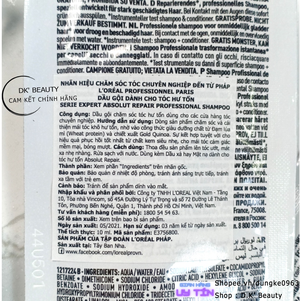 CÔNG DỤNG VÀ THÀNH PHẦN: - Dầu gội Absolut Repair Gold với protein hạt diêm mạch vàng (Gold Quinoa) phục hồi mái tóc hư tổn, trả lại diện mạo bóng mượt, mềm mại cho mái tóc. - Diêm Mạch Vàng (Gold Quinoa) được ví như vua của các loại hạt vì chứa hàm lượng protein và hàm lượng vitamin tự nhiên cao, giúp dưỡng ẩm và bảo vệ mái tóc khỏi các tác nhân gây hư tổn. Chiết xuất từ hạt diêm mạch được đánh giá có tác dụng tuyệt vời giúp phục hồi hư tổn và tăng cường đề kháng cho mái tóc. - Phục hồi tình trạng hư tổn toàn diện và đem đến vẻ mềm mại, suôn mượt, cam kết tóc không bết dính.