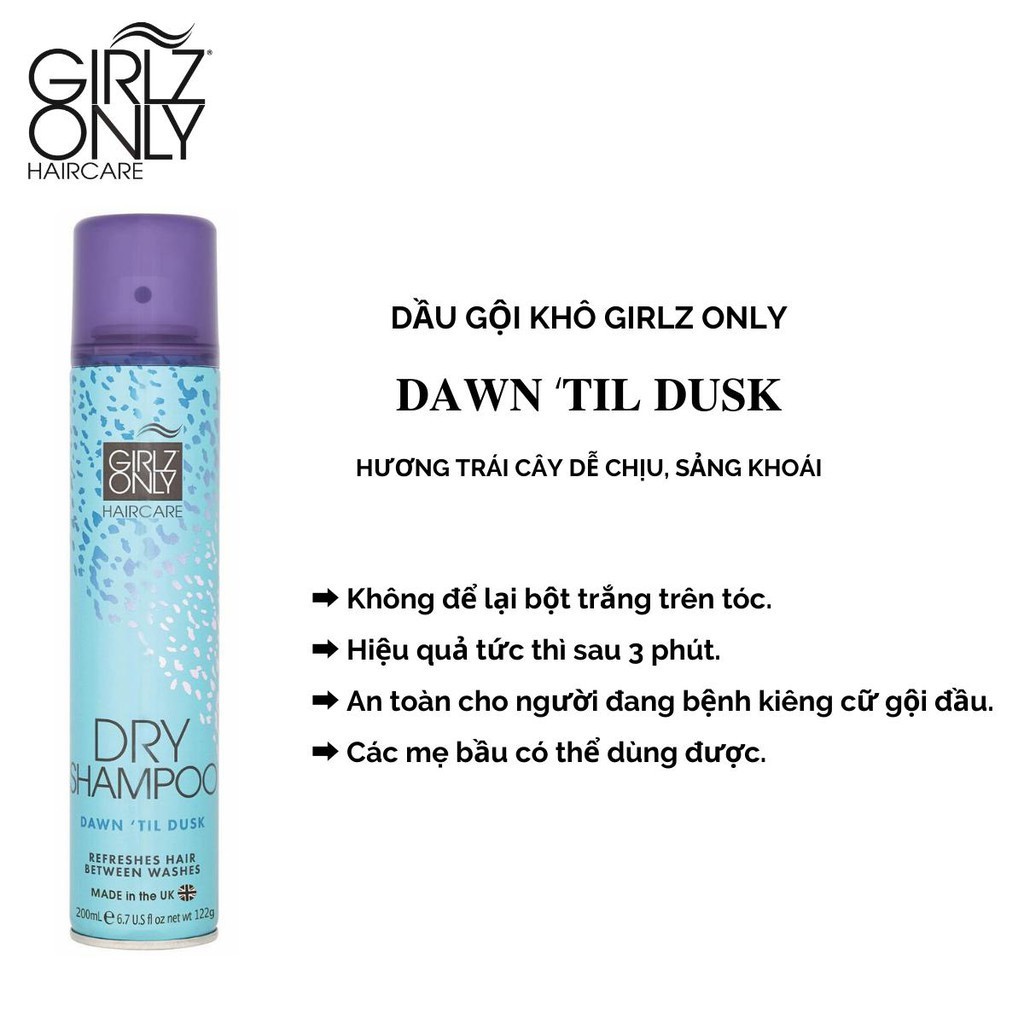 Giới thiệu Dầu Gội Khô Giúp Tóc Sạch Dầu Và Trở Nên Bồng Bềnh Ngay Lập Tức Girlz Only Dry Shampoo 200ml - Dawn 'Til Dusk (Xanh)