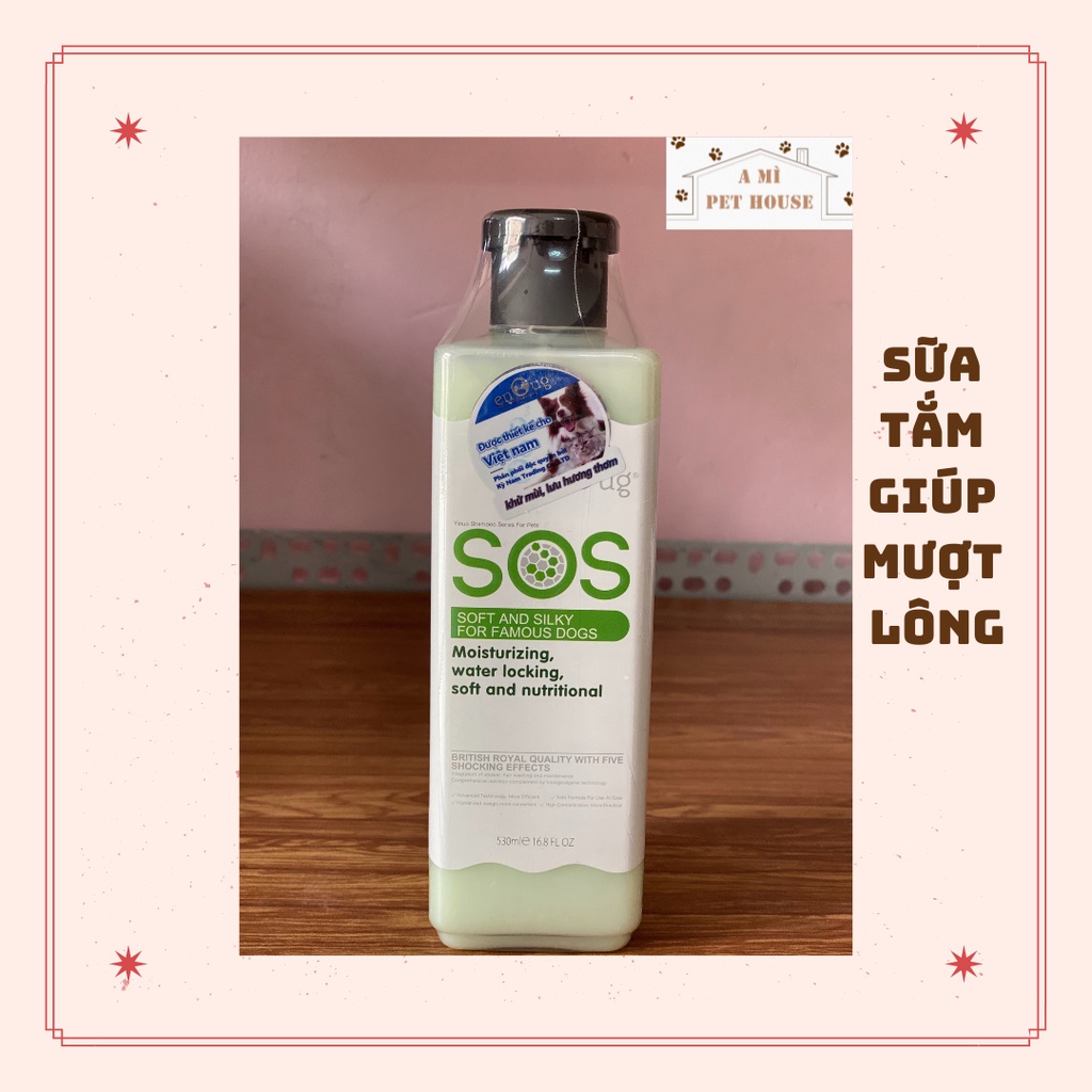 Sữa tắm SOS cho chó mèo có nhiều loại chuyên dụng khác nhau • SOS màu trắng: sản xuất dành riêng cho mèo • SOS nâu đỏ: tắm cho chó mèo có bộ lông nâu đỏ, đen • SOS hồng: dùng để khử sạch mùi hôi và tạo kiểu lông • SOS đen: sử dụng để phục hồi da tổn thương và đuổi ve rận • SOS xanh dương: dùng để tắm cho chó mèo lông trắng • SOS xanh lá: chuyên dùng làm mềm lông, mượt lông cho chó mèo – SOS màu xanh dương: loại dành cho chó lông trắng, giữ màu lông trắng không bị ngả vàng, các “Sen “ chỉ cần tắm 1 lần là có thể giúp bộ lông cải thiện độ trắng sáng, đặc biệt giúp lông mềm mượt, mịn và thơm lâu. – SOS màu nâu đỏ: loại dành cho chó có màu lông nâu đỏ luôn giữ màu lông, đặc biệt sau khi tắm sẽ có màu đỏ đồng & ánh kim. Nhìn rất đẹp mắt. – SOS màu xanh lá: làm mềm và mượt lông dành cho chó. Loại chuyên khử mùi cho tất cả các giống chó, với tính năng thơm lâu, giữ được mùi thơm và độ ẩm cho da, giúp cho các bé luôn thoải mái và không có mùi hôi. – SOS màu đen: giúp phục hồi da và lông dành cho chó. Đây là loại chăm sóc lông, khử mùi, diệt khuẩn, phòng ve rận cho tất cả các giống chó, với tính năng thích hợp cho nhiều giống chó, không gây kích ứng da. – SOS màu trắng: là loại dành riêng cho mèo, với công thức đặc biệt phù hợp với da và lông của mèo sẽ giúp chúng có bộ lông mềm mượt và thơm lâu. – SOS màu hồng: làm mịn, bông và tơi lông dùng trong tạo kiểu cho các dòng chó nổi tiếng **Dung tích: 530ml