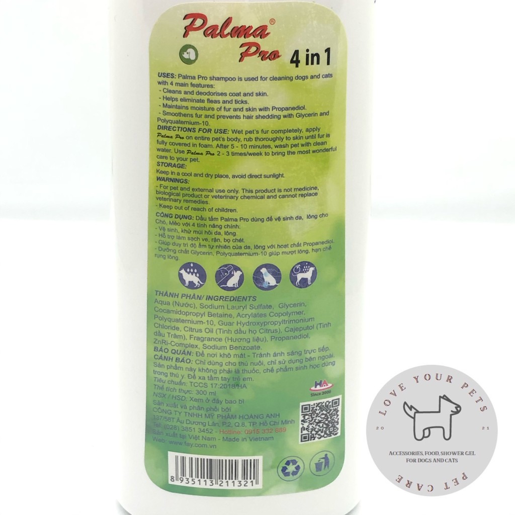 Chăm Sóc Thú Cưng > Làm đẹp cho thú cưng > Chăm sóc lông || Dầu tắm Palma Pro 300ml dành cho thú cưng (4 in 1) với 4 công dụng khử mùi, làm sạch ve, dưỡng lông, chống rụng lông.