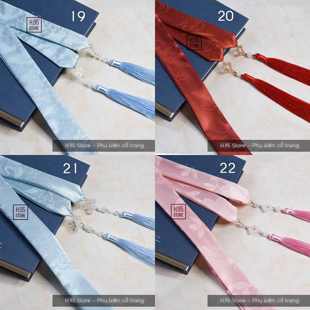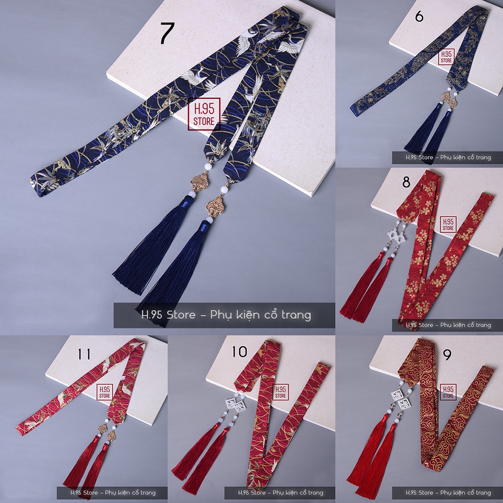 Dây buộc tóc cổ trang gắn tua rua ngọc bội - Kích thước: + Dây vải (mẫu 1 - 11) : Dài 150cm, rộng 2.5cm, tua dài 20cm + Dây lụa (mẫu 12 - 22) : Dài 190cm, rộng 2.8cm, tua dài 20cm - Dây buộc tóc cổ trang gắn tua rua ngọc bội ngoài công dụng chính là buộc (cột) tóc, tạo kiểu tóc cổ trang đơn giản thì còn có thể kết hợp làm thắt lưng khi mặc cổ trang, hán phục, kimono, trang phục cosplay; dùng làm caravat, nơ áo khi mặc trang phục cách tân, phụ kiện trang trí túi xách, ba lô..... - Màu sắc thực tế có thể lệch vài tông so với ảnh mẫu do ánh sáng, góc chụp và thiết bị hiển thị.