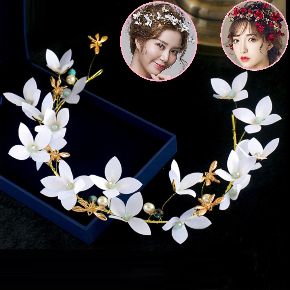 - Chất liệu: vải lụa mềm, hạt trai mỹ ký, hạt cườm, dây kim loại dẻo