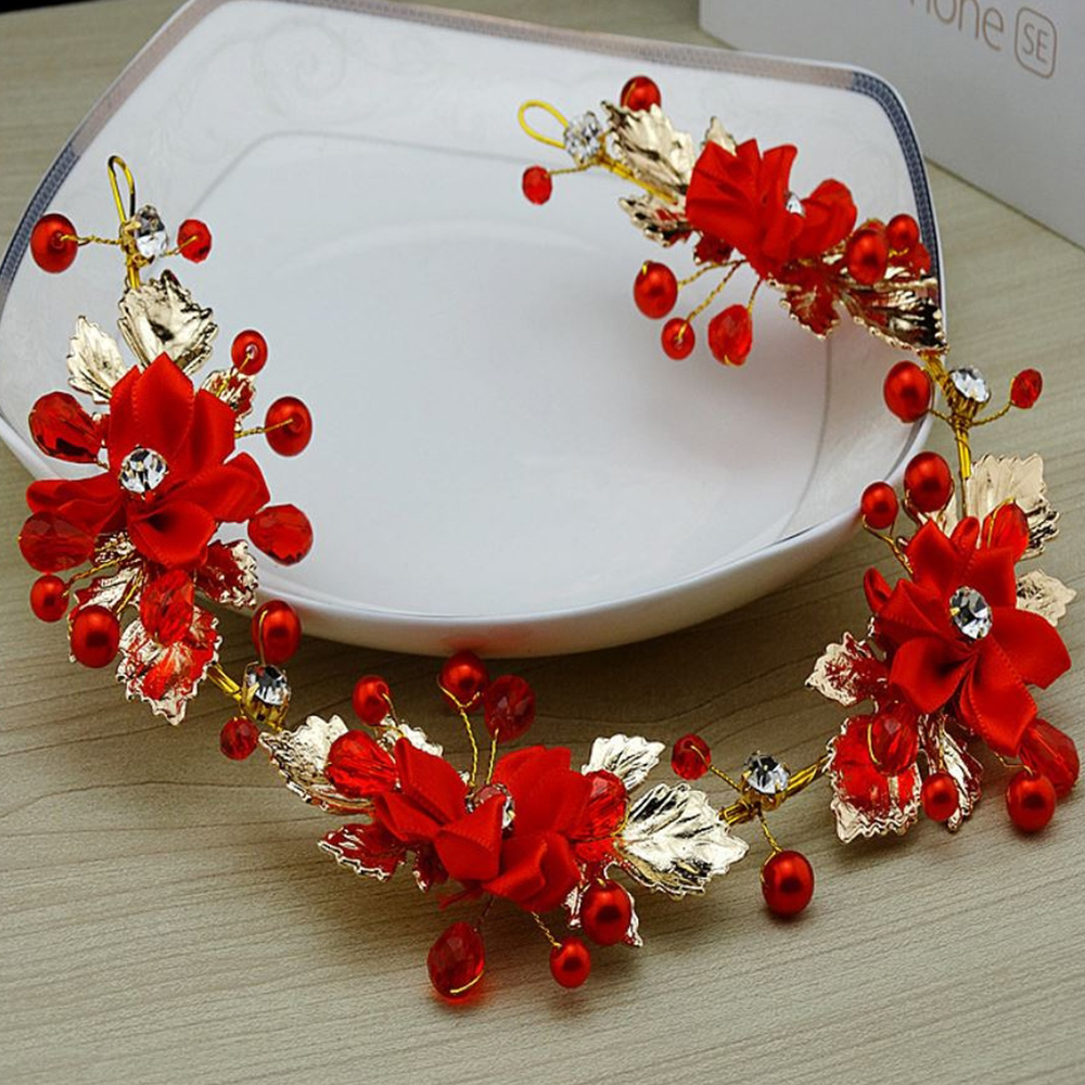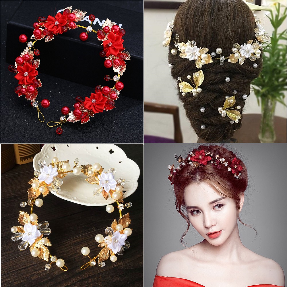 Chất liệu | Cánh Hoa Vải, Hạt Trai Mỹ Ký, Hạt Cườm, Plastic phủ nhũ, dây kim loại mạ dạng mềm |