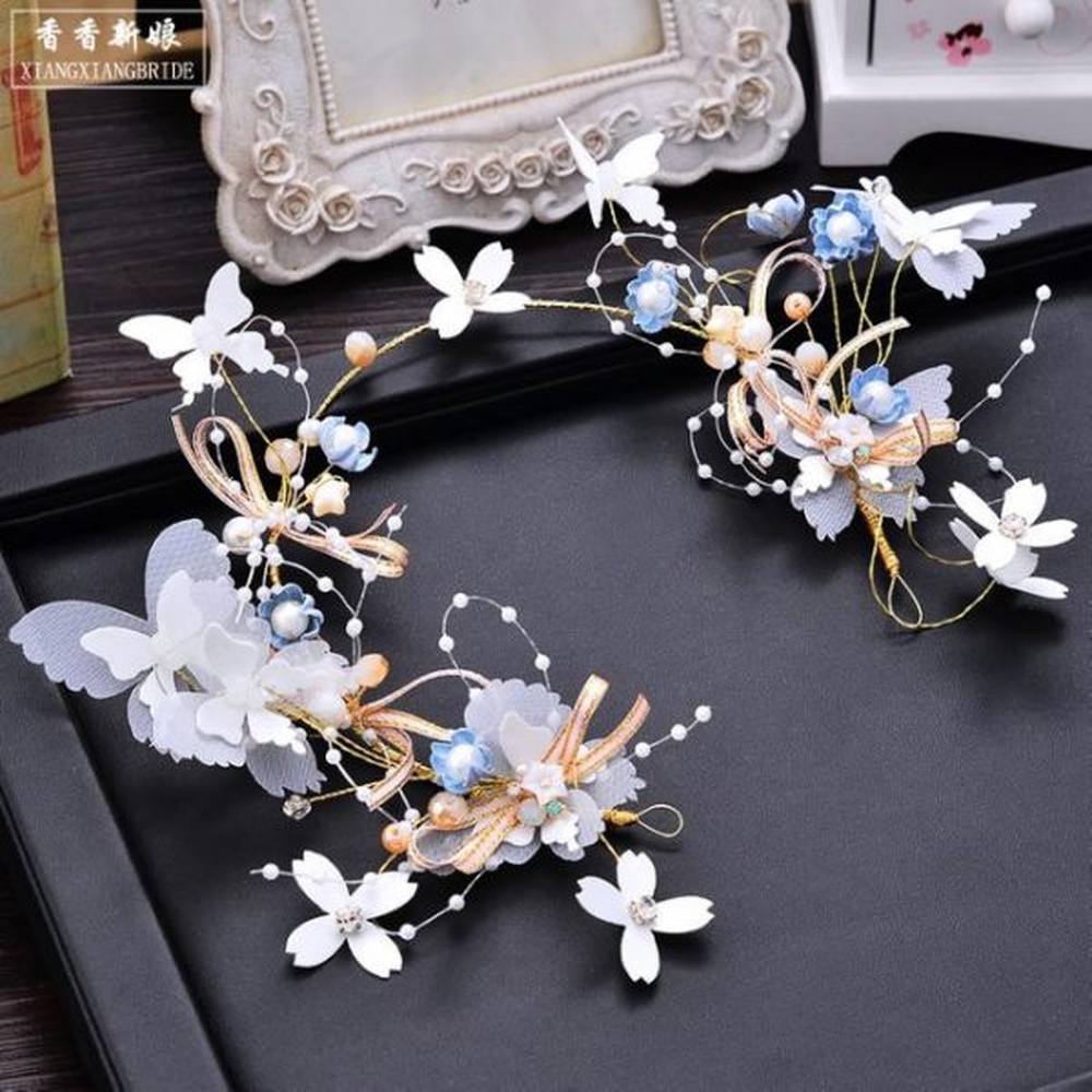 - Chất liệu: hoa vải voan và lụa bóng, dây ruy băng kim tuyế, hạt chai mỹ ký, hạt cườm và đá trang trí, hợp kim mạ màu