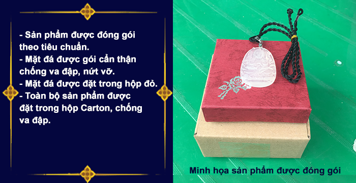 Sản phẩm được đóng gói theo tiêu chuẩn (như hình ảnh bên dưới): Mặt đá được gói cẩn thận chống va đập, nứt vỡ, được đặt trong hộp đỏ; toàn bộ được bọc ngoài lớp ni lông chống sốc đặt trong hộp carton.