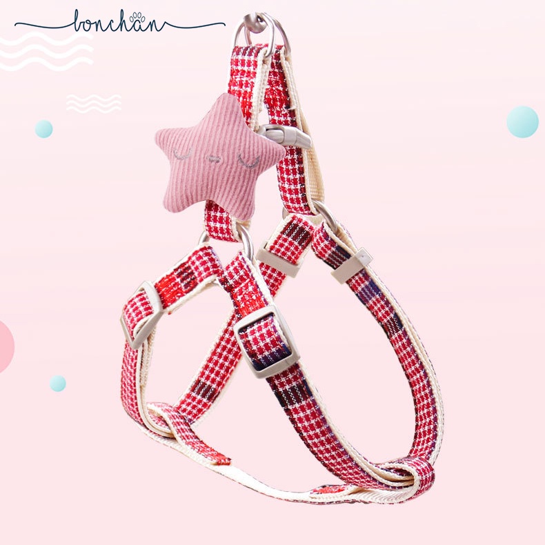 Giới thiệu Dây dắt chó mèo - Dây yếm và vòng cổ caro đỏ với ngôi sao hồng