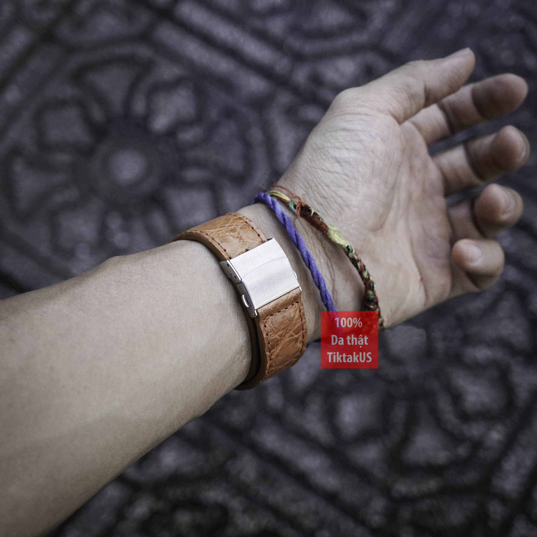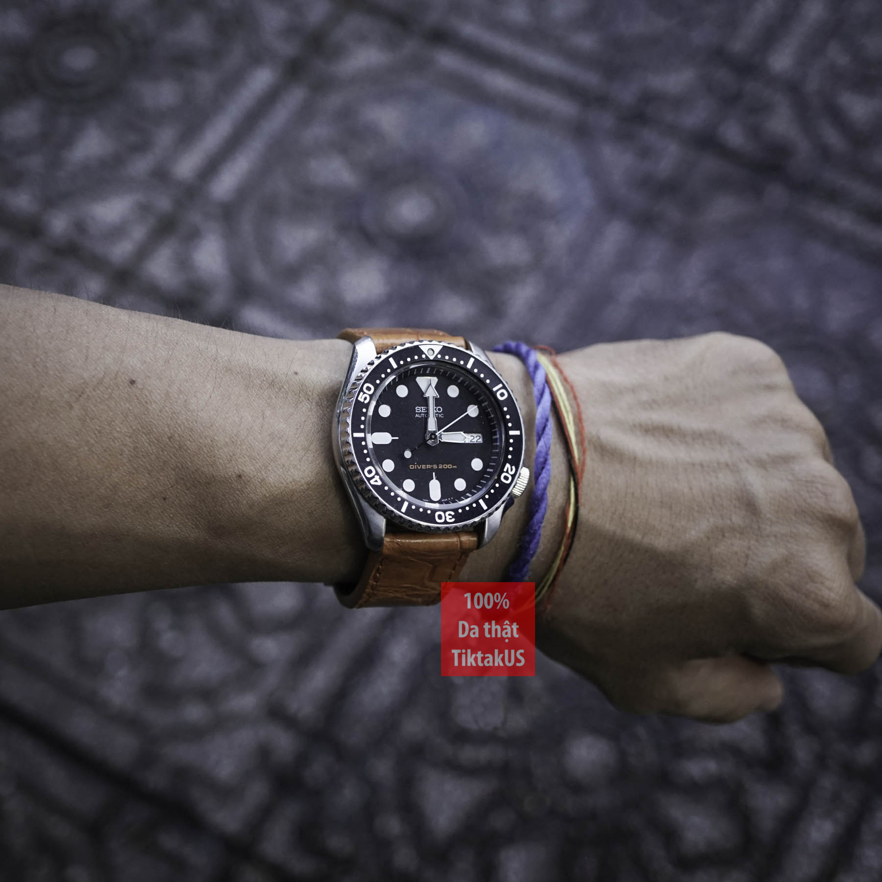 Dây đồng hồ da cá sấu thật được may tại Việt Nam với nguyên liệu da tuyển chọn.