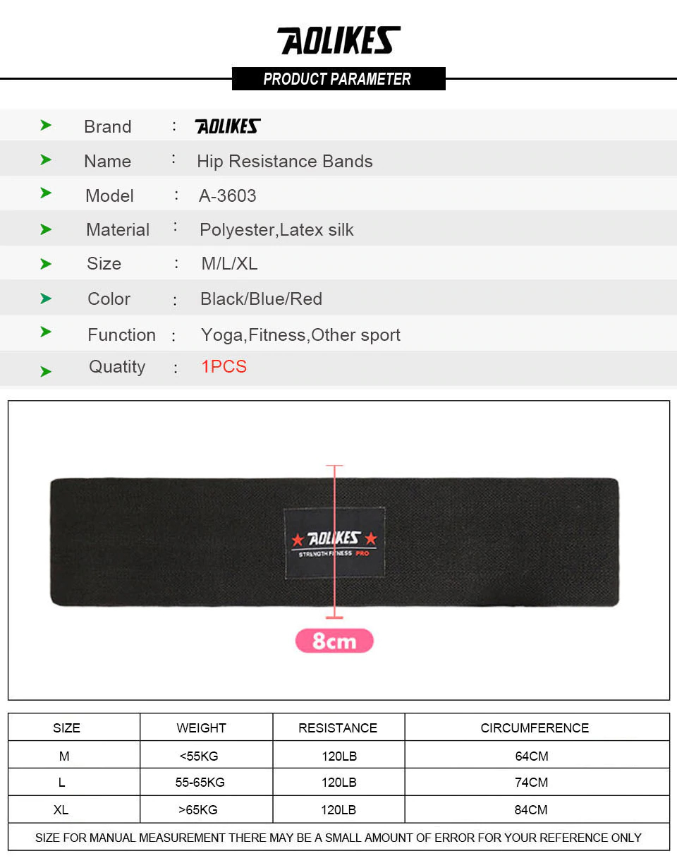 Dây đàn hồi kháng lực tập cơ mông đùi chân không trơn trượt Hip Resistance Bands AOLIKES A-3603 với thiết kế mềm mại chống trơn trượt, độ đàn hồi tốt thích hợp cho các bài tập cơ mông, chân, đùi một cánh toàn diện. Dây kháng lực giúp bạn có thể tập bất cứ nơi đâu như phòng tập thể dục, công viên, văn phòng, hoặc đi du lịch.
