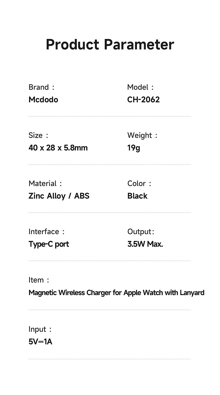 | Tên | Đế Sạc Cho AppleWatch Mcdodo Type-C Mangetic WIireless Charger for AppleWatch |