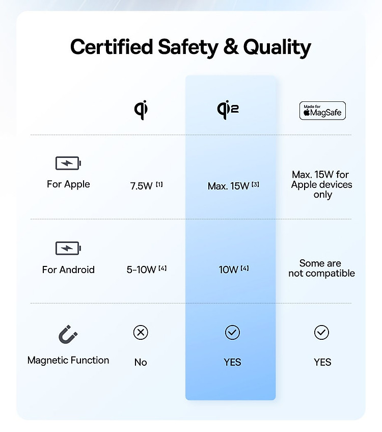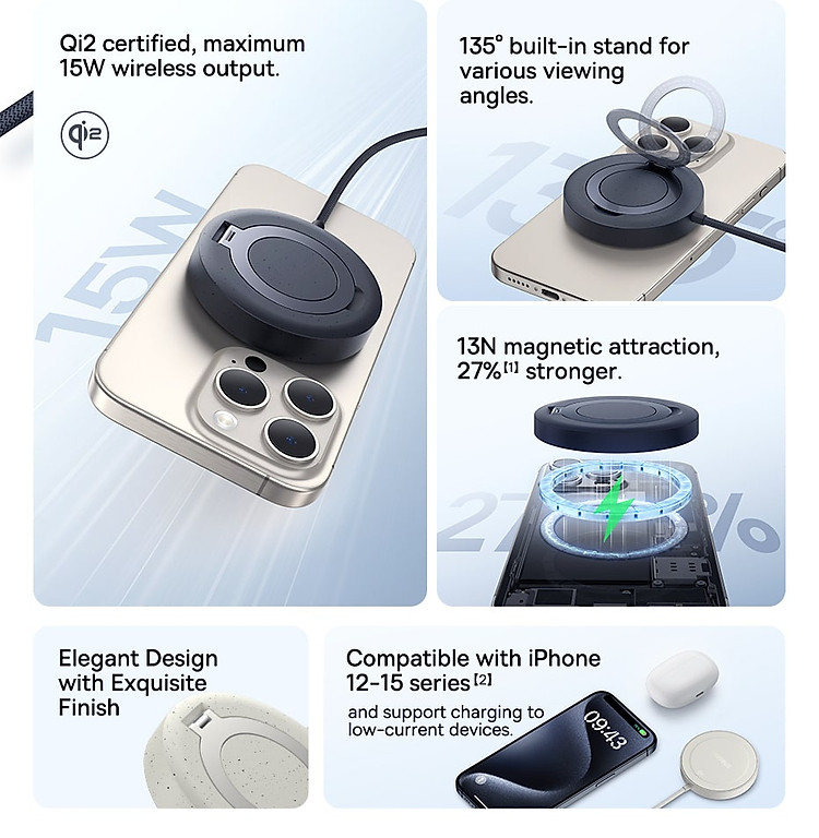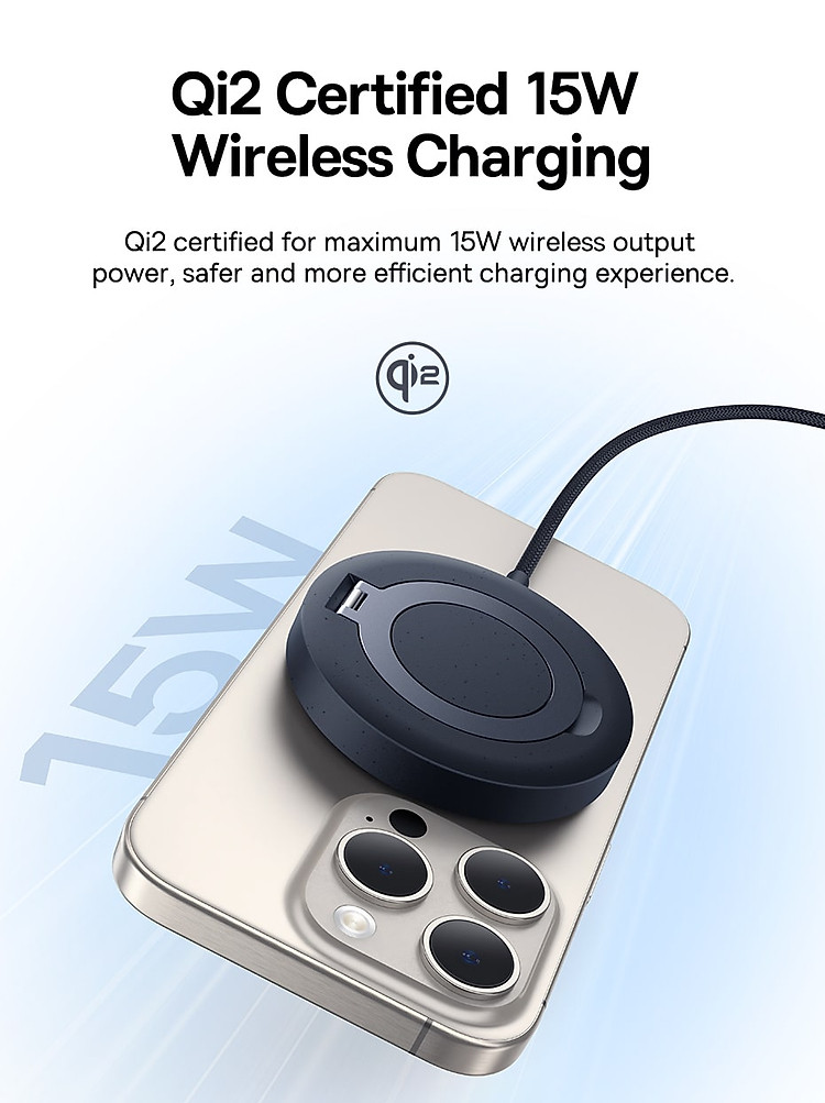 Chuẩn Sạc Không Dây Qi2: Sạc không dây theo chuẩn Qi2, tương thích với hầu hết các thiết bị di động hỗ trợ sạc không dây.