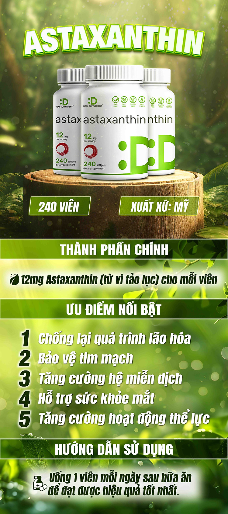 Nguyên liệu tự nhiên và an toàn: Deal Supplement Astaxanthin được chiết xuất từ tảo Haematococcus pluvialis, một nguồn tự nhiên giàu Astaxanthin. Sản phẩm không chứa các thành phần độc hại, không có GMO, không có gluten, và không có hương liệu nhân tạo hay chất bảo quản, đảm bảo an toàn cho sức khỏe của người sử dụng.