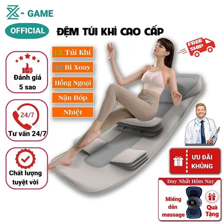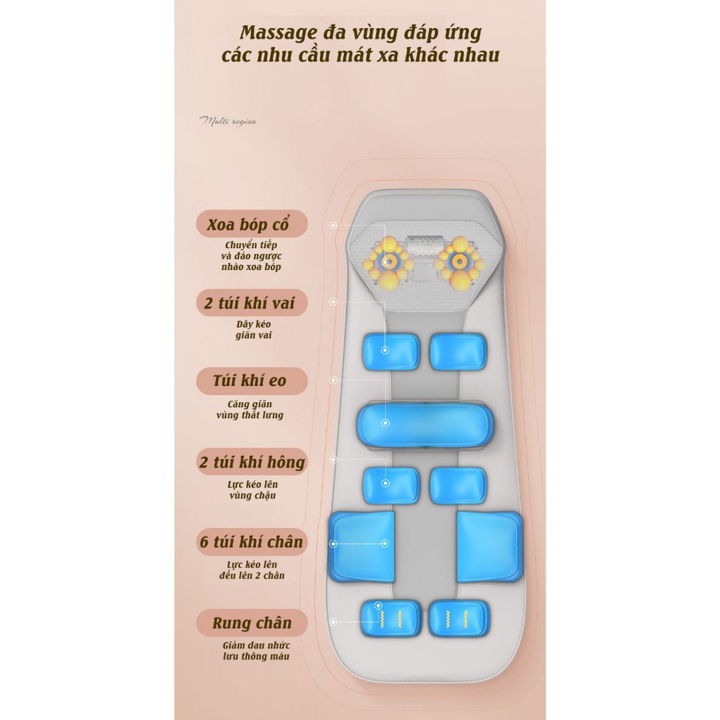 - Nệm Massage toàn thân là dòng nệm duy nhất trên thị trường có thiết kế túi khí, 12 túi khí trải dọc khắp cơ thể bóp và nhả liên tục giống như có 10 đầu ngón tay xoa bóp hỗ trợ lưu thông khí huyết và giảm căng cứng cơ
