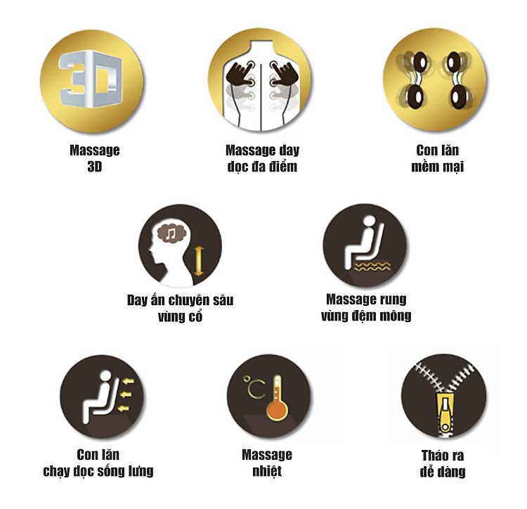 – Phần lưng: Với 4 con lăn cơ học và 8 đầu Massage kết hợp sử dụng cộng nghệ day ấn huyệt sẽ kích thích xoa bóp, giúp giảm lực chèn ép lên đĩa đệm, dây chằng và tủy sống giúp giảm đau lưng, giải tỏa căng thẳng tích tụ trên lưng đem lại cảm giác thư giản thoải mái.