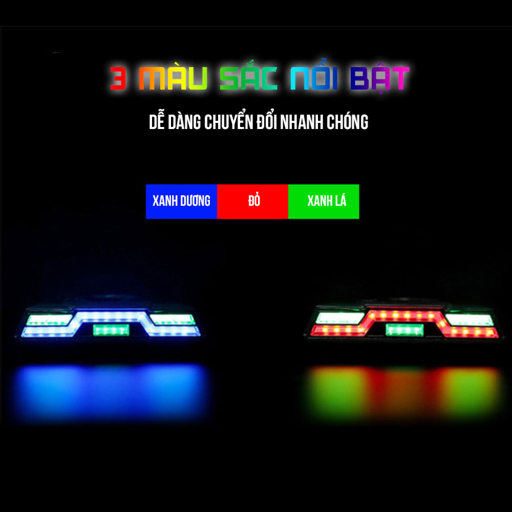 Sử dụng 30 bóng Led chính với Độ sáng cao và 16 bóng led phụ trợ giúp cảnh báo sáng hơn khi đi vào ban đêm Đèn led chỉ báo lượng pin còn lại bên trong, mỗi mức bóng tương ứng với 25% mức pin Dễ dàng Sạc điện qua cổng usb tiện lợi và nhanh chóng, phù hợp với đa các cổng sạc điện thoại micro USB thông thường/ phổ biến, hoặc qua củ sạc điện thoại di động, sạc dự phòng, USB máy tính/ PC Tiêu chuẩn Chống thấm nước, phù hợp với mọi điều kiện thời tiết thông thường Hiệu ứng ánh sáng thiết kế với 3 màu sắc: Đỏ, Xanh lá, Xanh dương, đẹp mắt phối hợp với 6 chế độ sáng cảnh báo khác nhau