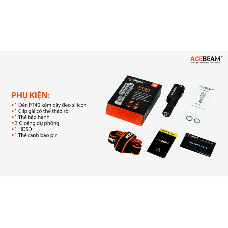 Bộ sản phẩm bao gồm : Một đèn ACEBEAM PT40 Một pin HG2 18650 đầu phẳng Một dây đeo đầu silicon Một clip gài Hai gioăng dự phòng Thẻ cảnh báo pin Thẻ bảo hành HDSD