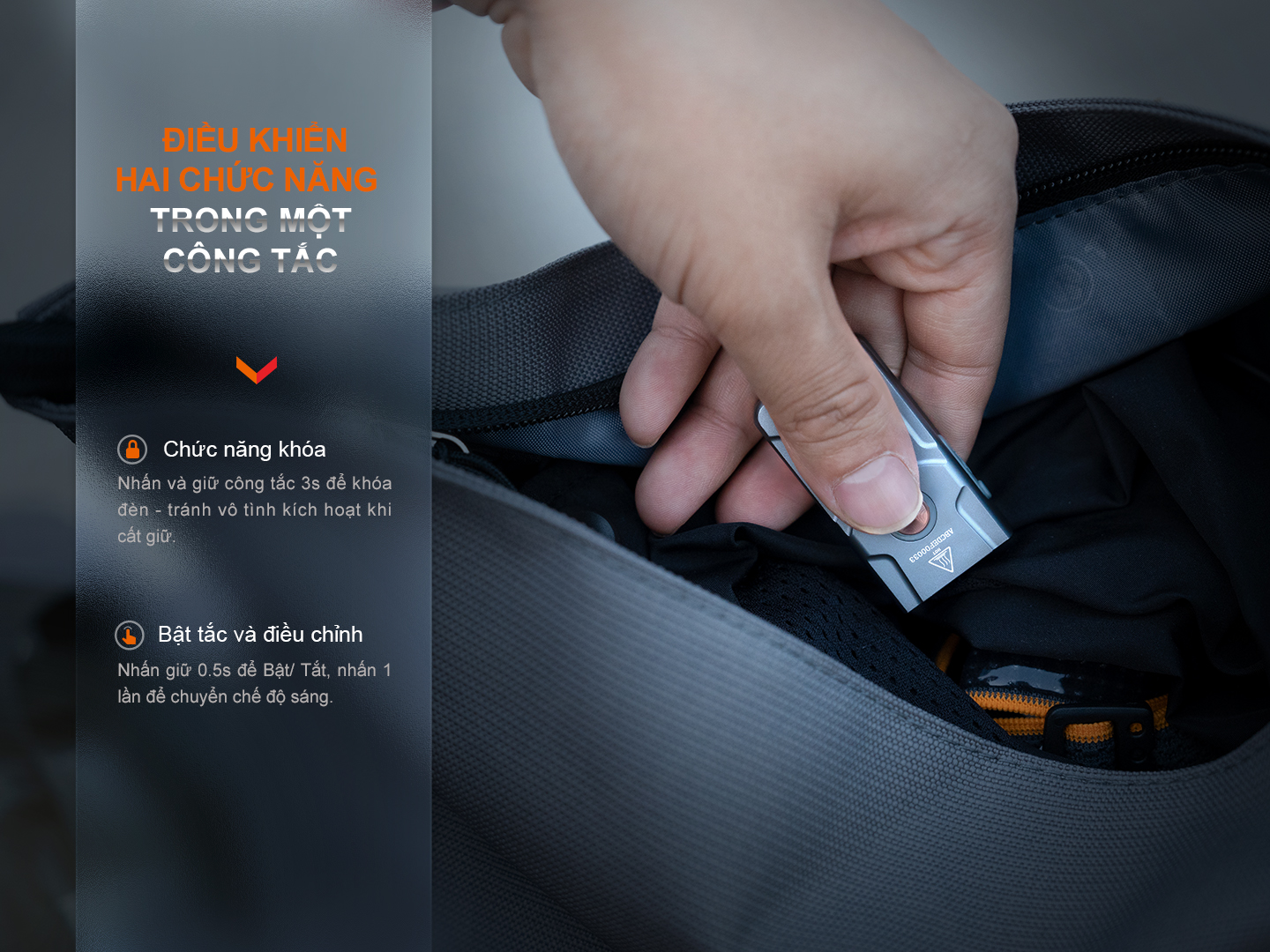Fenix E03R V2.0 có chế độ khóa an toàn, chống vô tình kích hoạt. Bạn có thể dễ dàng mang theo chiếc đèn này mọi lúc mọi nơi.