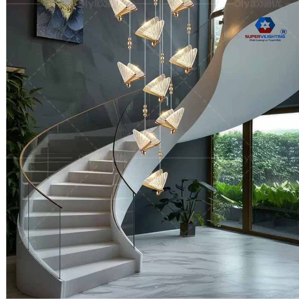 • Đèn thả cầu thang, thông tầng: nổi bật kiến trúc xoắn ốc, tôn lên nét độc đáo.
