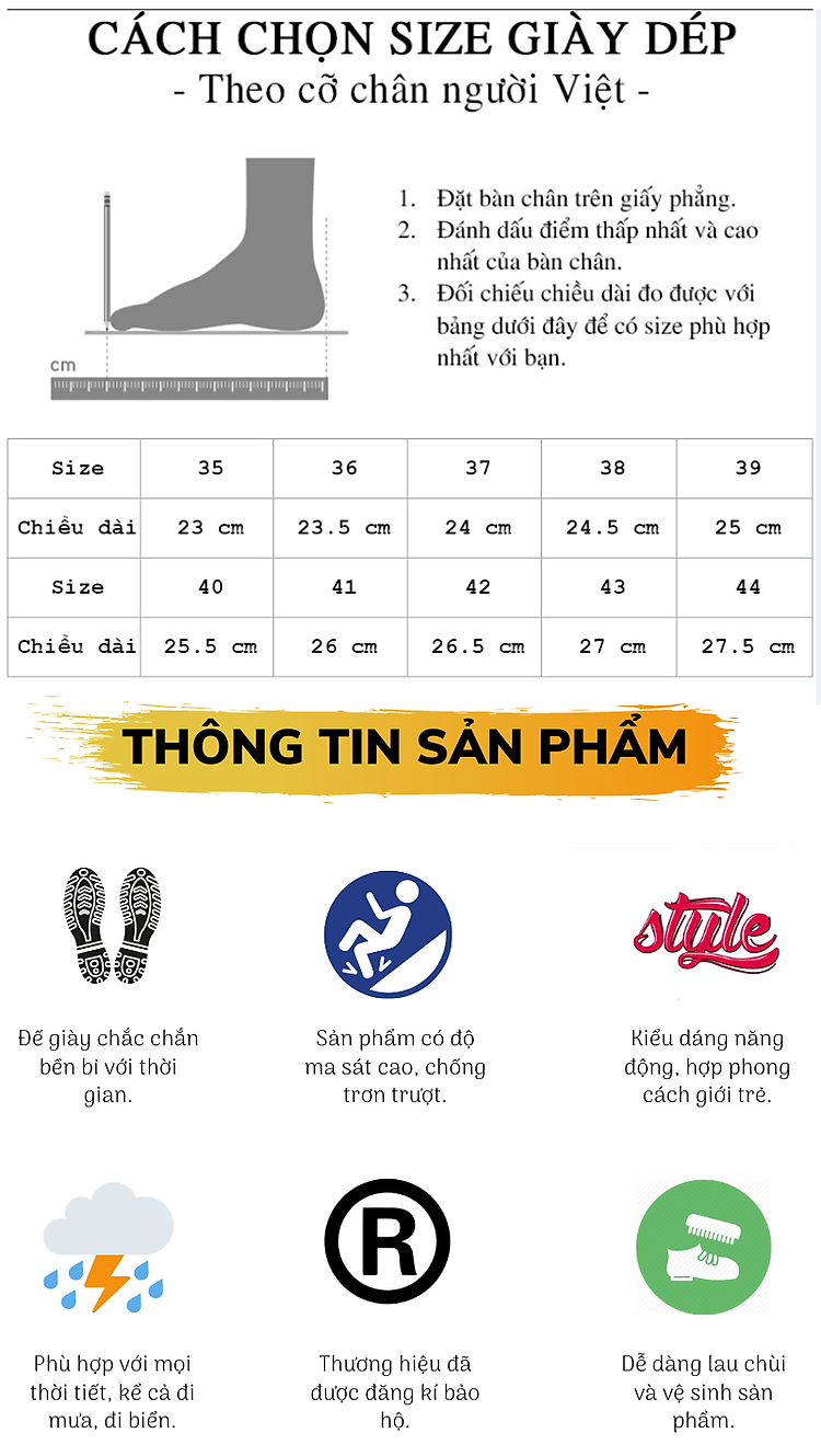 Kiểu dáng trẻ trung năng động, hợp thời trang. Đi cực êm ái, kết hợp được rất nhiều loại quần áo.Chất liệu cao cấp tạo sự thoải mái khi sử dụng. Đế cao 3cm đi cực đầm chân Dễ phối cùng nhiều kiểu trang phục khác nhau. Mẫu mã trẻ trung, phù hợp xu hướng 2022 Màu sắc: 3 màu cá tính, họa tiết bắt mắt