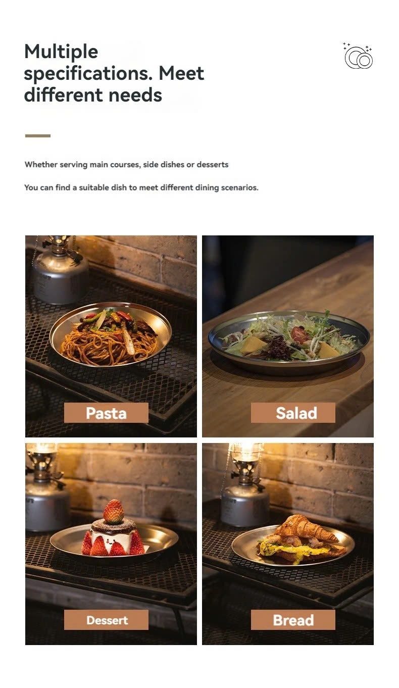 Các đĩa có vành thấp và có bốn kích cỡ với độ sâu vừa phải, khiến chúng trở nên vô cùng linh hoạt. Có thể sử dụng cho nhiều mục đích khác nhau, từ đồ ăn nhẹ đến bát đĩa.