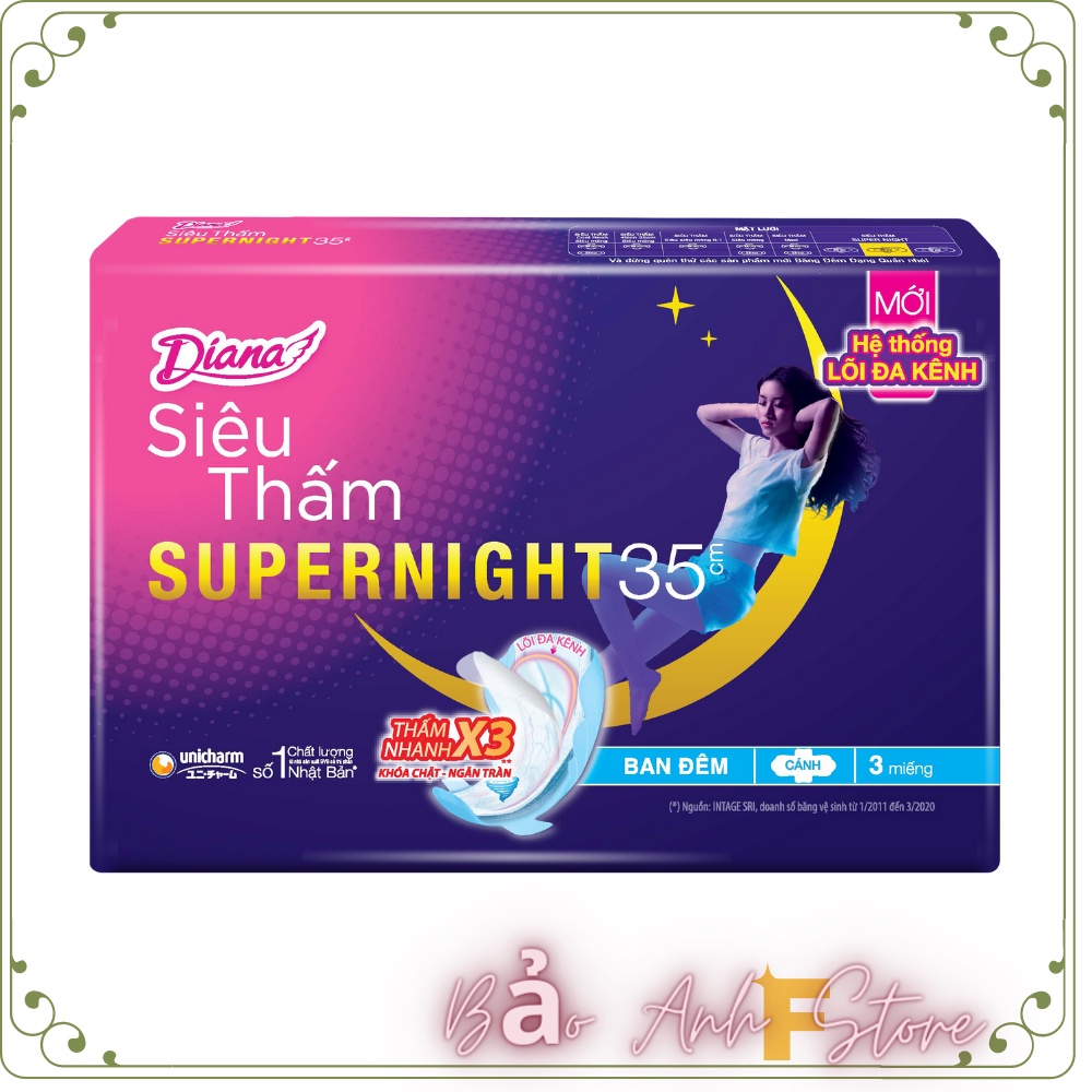 Băng Vệ Sinh Diana Super Night 35cm (Gói 3 Miếng) có chiều dài lý tưởng đến 35cm cùng rãnh chống tràn và thiết kế mở rộng về phía sau sẽ giúp bảo vệ bạn gái trong giấc ngủ. Hệ thống thấm hút độc đáo giúp thấm hút nhanh và khóa chặt chất lỏng, cho bạn cảm giác khô thoáng, không lo chất dịch bị trào ngược gây khó chịu. Bề mặt băng mềm mại với hương thơm dễ chịu giúp bạn luôn được thư giãn kể cả trong những ngày nhạy cảm. -------------------------------------- Cam kết của Bảo Anh F shop với quí khách hàng: - Hàng chính hãng 100% - Hàng mới nguyên tem,nguyên bao bì - Chất lượng đảm bảo - Luôn sẵn sàng hổ trợ khách hàng 24/7 - Vận chuyển nhanh và ngay tới khách trong thời gian nhanh chóng - Nói không với hàng kém chất lượng