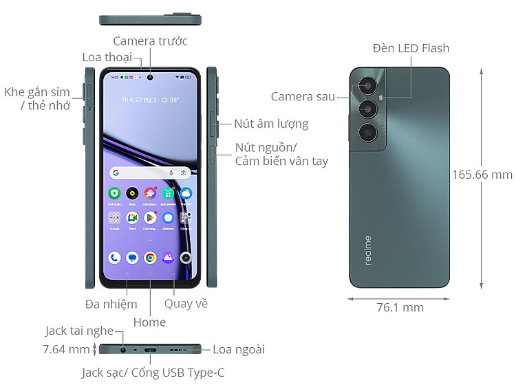Với thiết kế đầy sang trọng và thời thượng, realme C65 siêu bắt mắt với các gam màu gradient chuyển đổi trên mặt lưng. Được hoàn thiện từ nguyên khối với mặt lưng cùng viền phẳng, chiếc máy mang lại cảm giác cầm vô cùng chắc chắn, đặc biệt là khi sử dụng liên tục trong thời gian dài. Thân máy được hoàn thiện mỏng chỉ 7,64mm hỗ trợ mang lại trải nghiệm cầm nắm thoải mái.