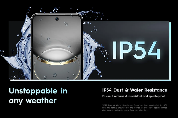 Một điểm đáng chú ý khác trong thiết kế của Tecno Spark 30 5G là khả năng chống bụi và chống nước theo tiêu chuẩn IP54. Điều này đồng nghĩa với việc điện thoại có thể chống chịu được nước bắn từ mọi hướng cũng như bụi bẩn, mang lại sự an tâm cho người dùng khi sử dụng trong điều kiện môi trường khác nhau.