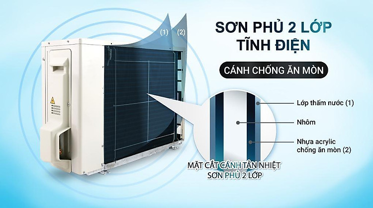 Dàn tản nhiệt là bộ phận dễ bị ăn mòn bởi các tác nhân thời tiết, bụi bặm hoặc khu vực có nồng độ muối cao. Trên chiếc Điều hòa này, cánh dàn tản nhiệt sẽ được phủ 2 lớp tĩnh điện: lớp nhựa acrylic và lớp chống thấm nước để tăng khả năng chống mưa axit và sự ăn mòn của muối giúp cho thiết bị nhà bạn được bền bỉ hơn.