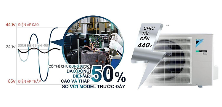 Với khả năng chịu tải đến 440V giúp bo mạch của máy hoạt động ổn định hơn ở những khu vực có điện áp không ổn định.