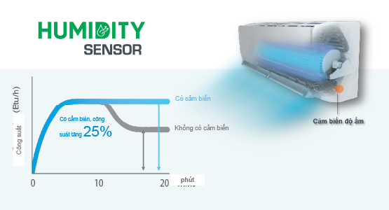 Với cảm biến ẩm - Humidity Sensor bên trong dàn lạnh giúp tăng cường khả năng khử ẩm và làm lạnh nhanh hơn 25% so với dòng máy thông thường, giúp mang lại cảm giác thoải mái tối đa ngay khi thời tiết oi bức.