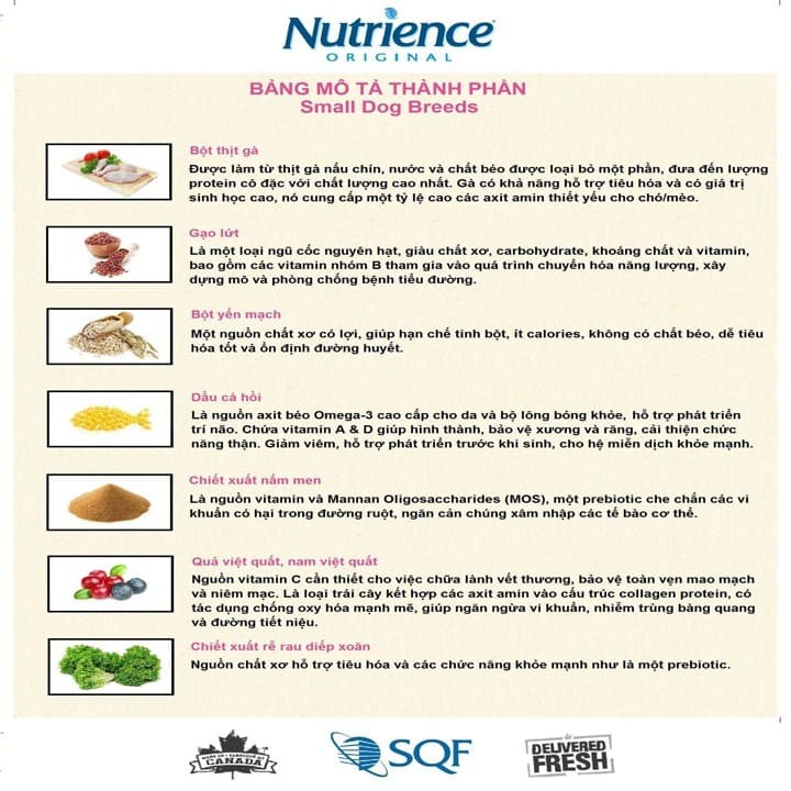 Nutrience Original Adult Small Breed - Thức Ăn Cho Chó Nhỏ là một công thức dinh dưỡng toàn diện và cân bằng được Nutriencce nghiên cứu và phát triển cho các giống chó kích thước nhỏ đã trưởng thành (trên 12 tháng)