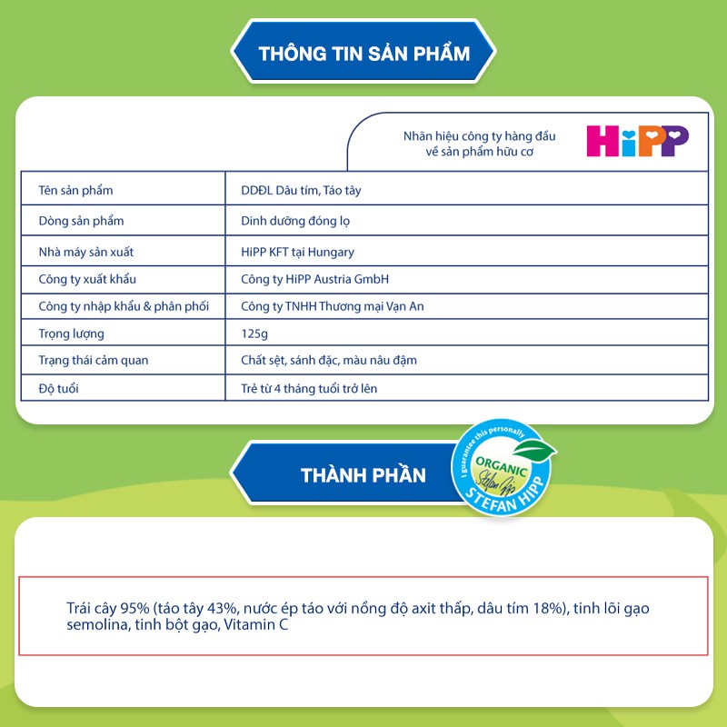1. THÔNG SỐ KỸ THUẬT - Model: AL4273-02-U - Thương hiệu (Xuất xứ): HUNGARY - Dòng sản phẩm: DDĐL Dâu tím, táo tây (125g) (an toàn với trẻ có nguy cơ dị ứng thức ăn cao) - Độ tuổi sử dụng: 6 tháng tuổi trở lên - Khối lượng: 125g - Hương vị: DDĐL Dâu tím, táo tây (125g) (an toàn với trẻ có nguy cơ dị ứng thức ăn cao) - Hạn sử dụng: 19 tháng kể từ ngày sản xuất. *** Bao bì được thay đổi theo từng đợt nhập hàng