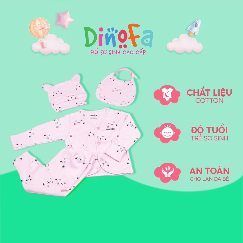 Bộ quần áo sơ sinh đồ bộ bé trai bé gái dài tay, cúc thẳng chất cotton, Set 4 món cho trẻ sơ sinh 0-3m hình gấu_B01 THÔNG TIN SẢN PHẨM: - Thương hiệu: DINOFA - Xuất xứ: Việt Nam - Chất liệu: 100% cotton cao cấp ( Vải mềm mịn ) - Họa tiết: Gấu dễ thương - BẢNG SIZE: 0 - 3M (3 - 6,5kg)