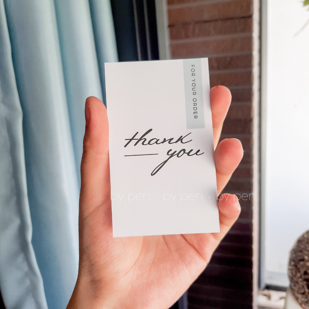 ___________________________ Mô tả sản phẩm: - ẢNH THẬT SHOP TỰ CHỤP 100% - MẪU SHOP THIẾT KẾ ___________________________ Quy cách: - Túi zipper, 50 cái 1 túi - Kích thước 9x5.5cm - Chất liệu: C300gsm - Màu sắc: xanh xám nhạt, nền trắng, chữ đen - Nội dung trên card: chữ THANK YOU cách điệu, có dải chữ FOR YOUR ORDER, mặt sau cảm ơn, KHÔNG CÓ DÒNG ĐÁNH GIÁ 5 SAO, xem ảnh để biết thêm nhé ___________________________ Cách sử dụng/Công dụng: - Chuyên dùng cho các shop bán hàng, mới kinh doanh online, chưa chắc chắn để in card theo ý cá nhân, card bên shop có sẵn, số lượng ít, giá thành hợp lí, màu sắc kiểu dáng đa dạng, nhiều sự chọn lựa. Các shop mới KDOL nên tham khảo mẫu card có sẵn này ạ! - Bên shop cũng có in card theo yêu cầu => 160k/500 card in theo yêu cầu ___________________________ SOCIALS: - Chỉ bán tại SHOPEE - Địa chỉ: Q. Thủ Đức (TP.Thủ Đức, HCM)