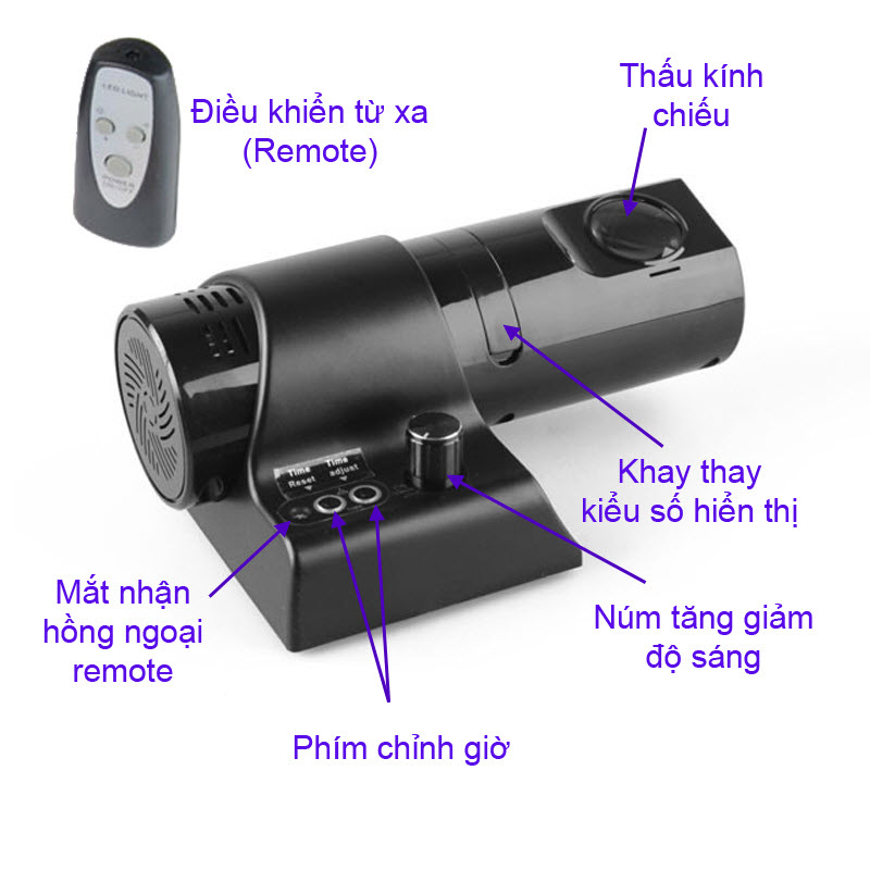 * Đồng hồ chiếu giờ có chức năng điều khiển từ xa (tắt bật và điều chỉnh độ sáng)