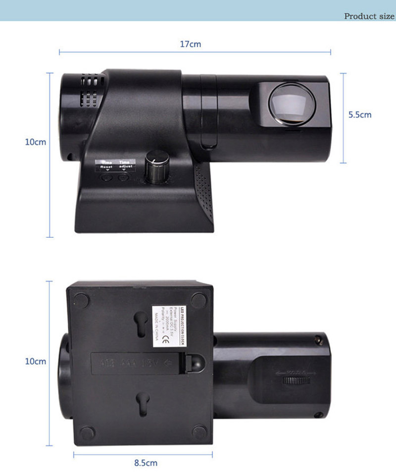 * Khoảng cách chiếu từ 1,5 đến 7 mét cho đường kính đồng hồ từ 0.5m đến 2m (nếu trong môi trường ánh sáng xung quanh là tối, ví dụ như phòng ngủ thì có thể chiếu xa hơn để đồng hồ to hơn)