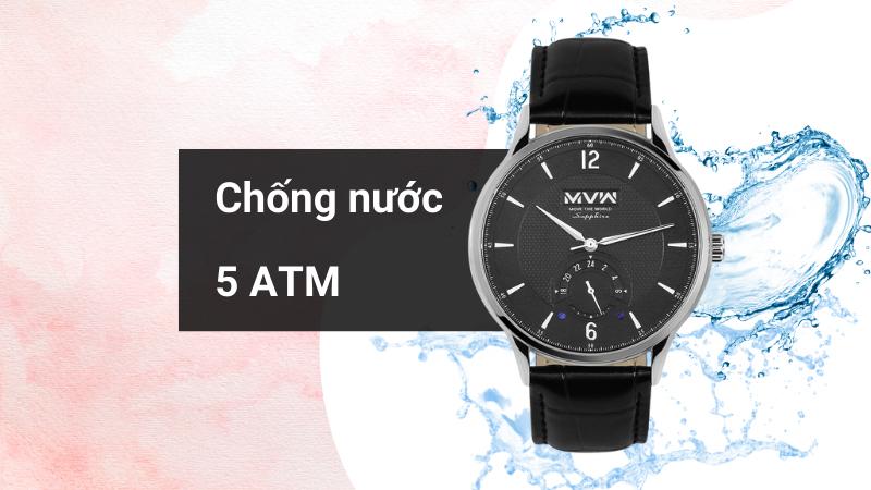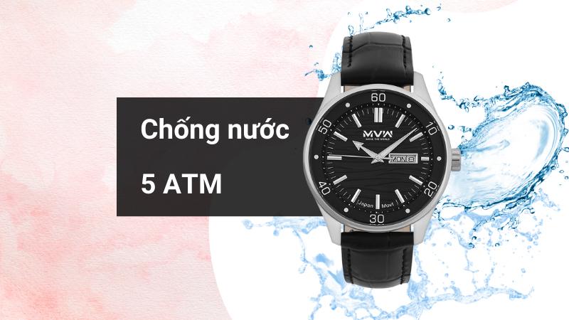 - Nước đã không còn là vấn đề lo ngại khi bạn có thể đeo đồng hồ ngay cả khi rửa tay, đi mưa hay đi tắm nhờ vào thông số chống nước 5 ATM tối ưu. Lưu ý: không đeo khi đi bơi, lặn.
