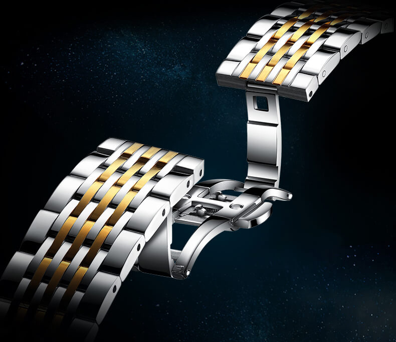 Dưới lớp kính, các cọc số mảnh cùng bộ kim sắc nhọn mạ vàng nổi bật trên nền trắng. Bên ngoài, phần dây được chế tác từ thép 316L chống xước và chống ăn mòn cực tốt, nhấn nhá thêm 3 dải demi chạy dọc dây đeo. Kết hợp cùng công nghệ mạ PVD tiên tiến, cỗ máy sẽ luôn bền màu và sáng bóng dài lâu.