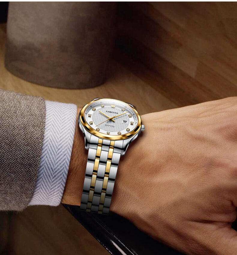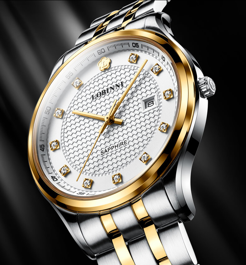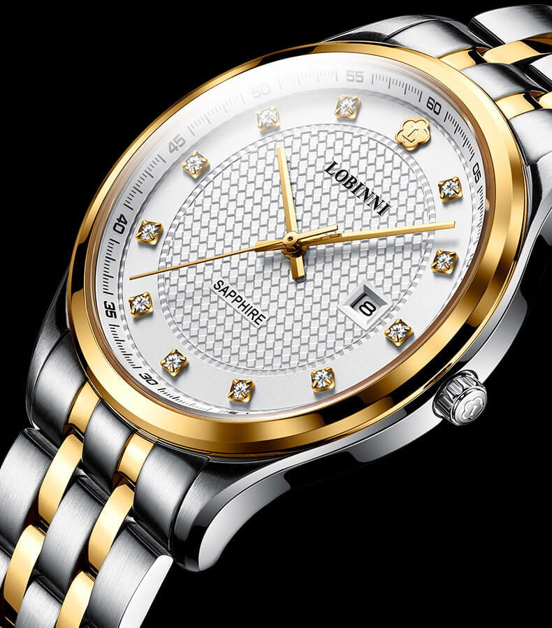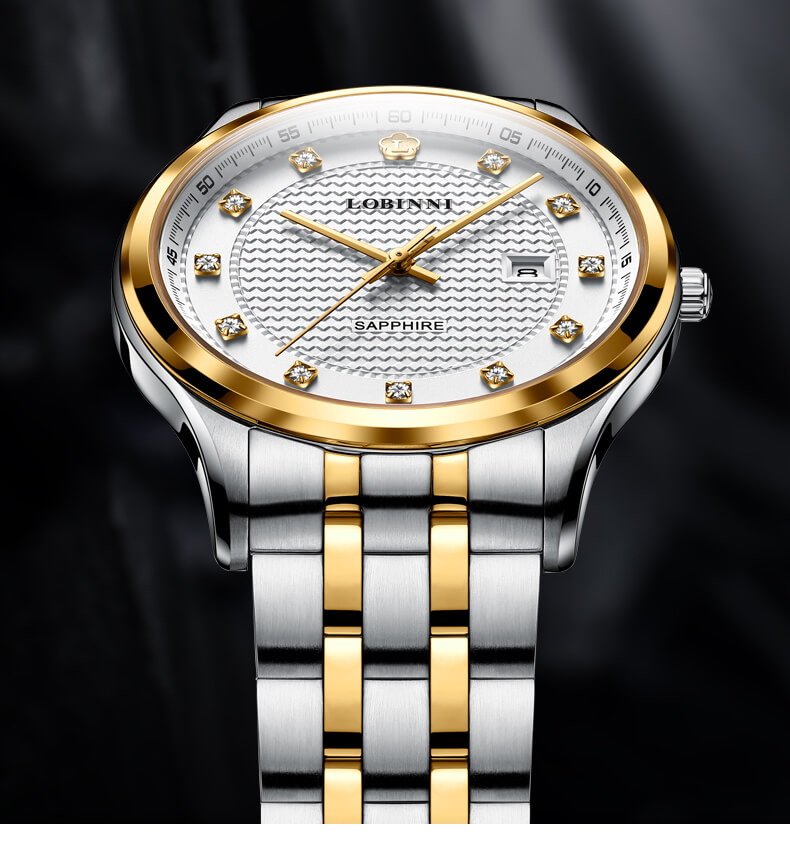 Toàn bộ cọc Số đều được đính đá nhân tạo, Tô điểm cho sự sang trọng quyền quý mà chiếc đồng hồ Lobinni L3006 mang lại cho người đeo